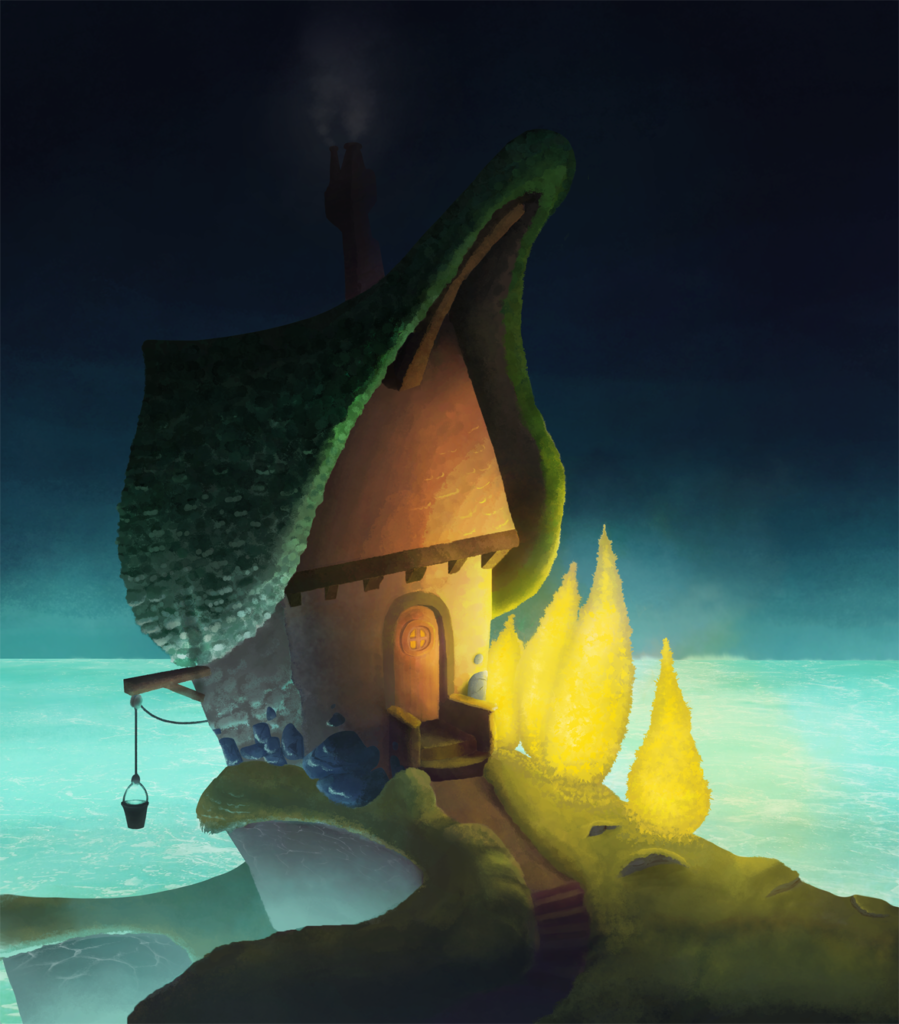 To make the painterly shaders of the environment, we first tried to get close to the mood I wanted by lighting and shading the scene. Then we would render an isolated light- and shadow version of the scene to be painted over in Photoshop. After that process, we build a shader that uses the light and dark renders as a projected base for the final lighting. This time with characters in the scene, and all the lighting and shadows reacting to the painterly base.